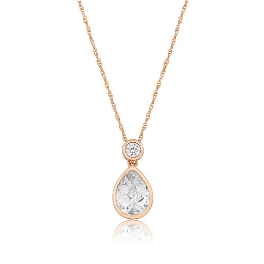 A bright and beautiful Necklace with a teardrop-shaped Cubic Zirconia and a Rose Gold setting which enhances the clear, faceted stone. A lovely little piece of subtle luxury. Wear with matching earrings for extra sparkle.