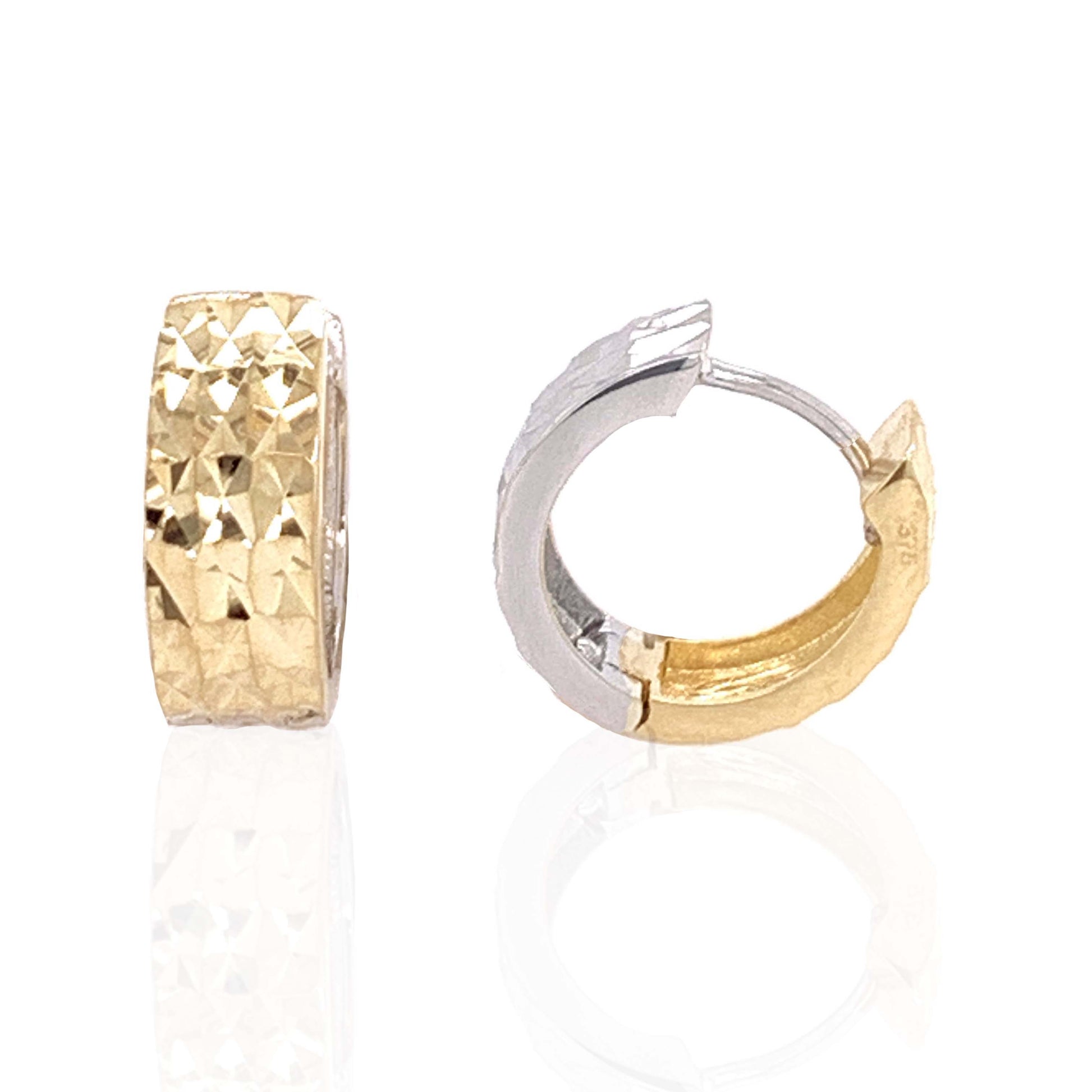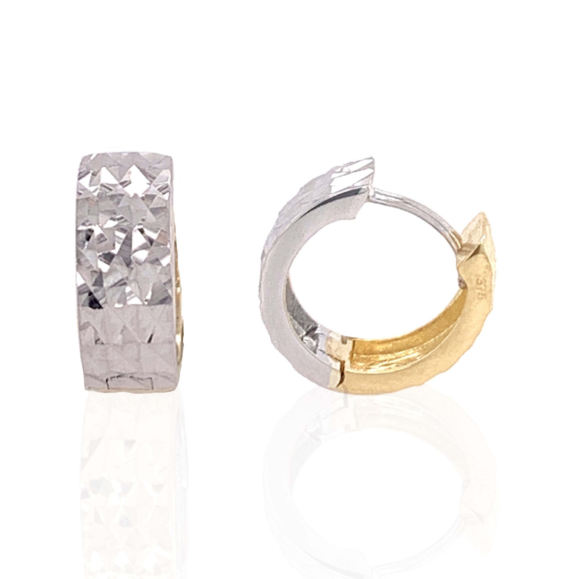 For all those lovers of multicoloured gold - these contemporary hoops are for you. Made from 9ct Yellow and White Gold with a Diamond cut texture. These Earrings have an easy hinged fastening and are reversible.Be glorious in yellow today and in white tomorrow.Unusual, beautiful and versatile.