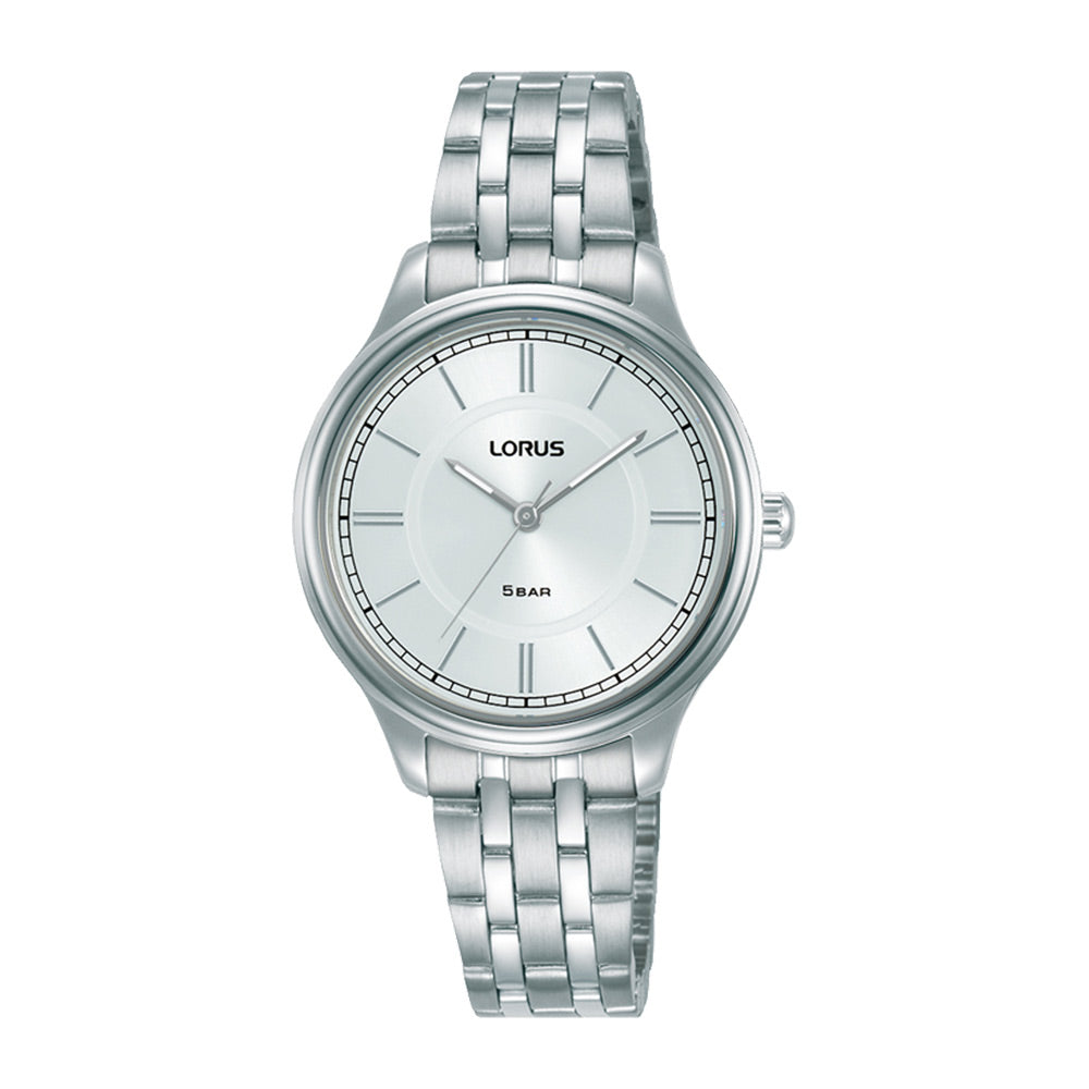 A Lorus Ladies Heritage collection dress watch. The 32mm stainless steel case features a sunburst silver dial with silver markers and luminous hands.