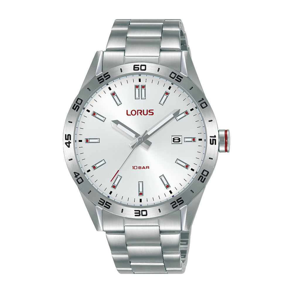 A Lorus Gents Sport Collection Watch. The 40mm stainless steel case features a silver sunray dial with luminous hands, contrasting red detailing, stainless steel batons and features a date function.